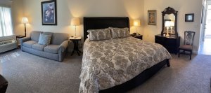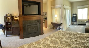 irst-floor Cottage Suite with two full-size beds and one upholstered chair and half, screened-in porch overlooking gazebo and courtyard area, remote control gas fireplace with 42″ Wi-Fi TV built-in, single serve pod coffee maker (we provide the pods), microwave, mini-fridge. Drop leaf table for games, beautiful drop front desk and large Eastlake Victorian mirrored dresser. Deep two-person whirlpool tub, walk-in shower, hairdryer.