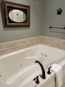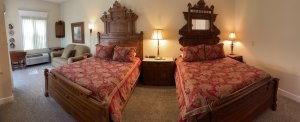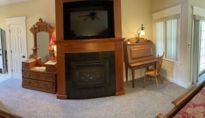irst-floor Cottage Suite with two full-size beds and one upholstered chair and half, screened-in porch overlooking gazebo and courtyard area, remote control gas fireplace with 42″ Wi-Fi TV built-in, single serve pod coffee maker (we provide the pods), microwave, mini-fridge. Drop leaf table for games, beautiful drop front desk and large Eastlake Victorian mirrored dresser. Deep two-person whirlpool tub, walk-in shower, hairdryer.