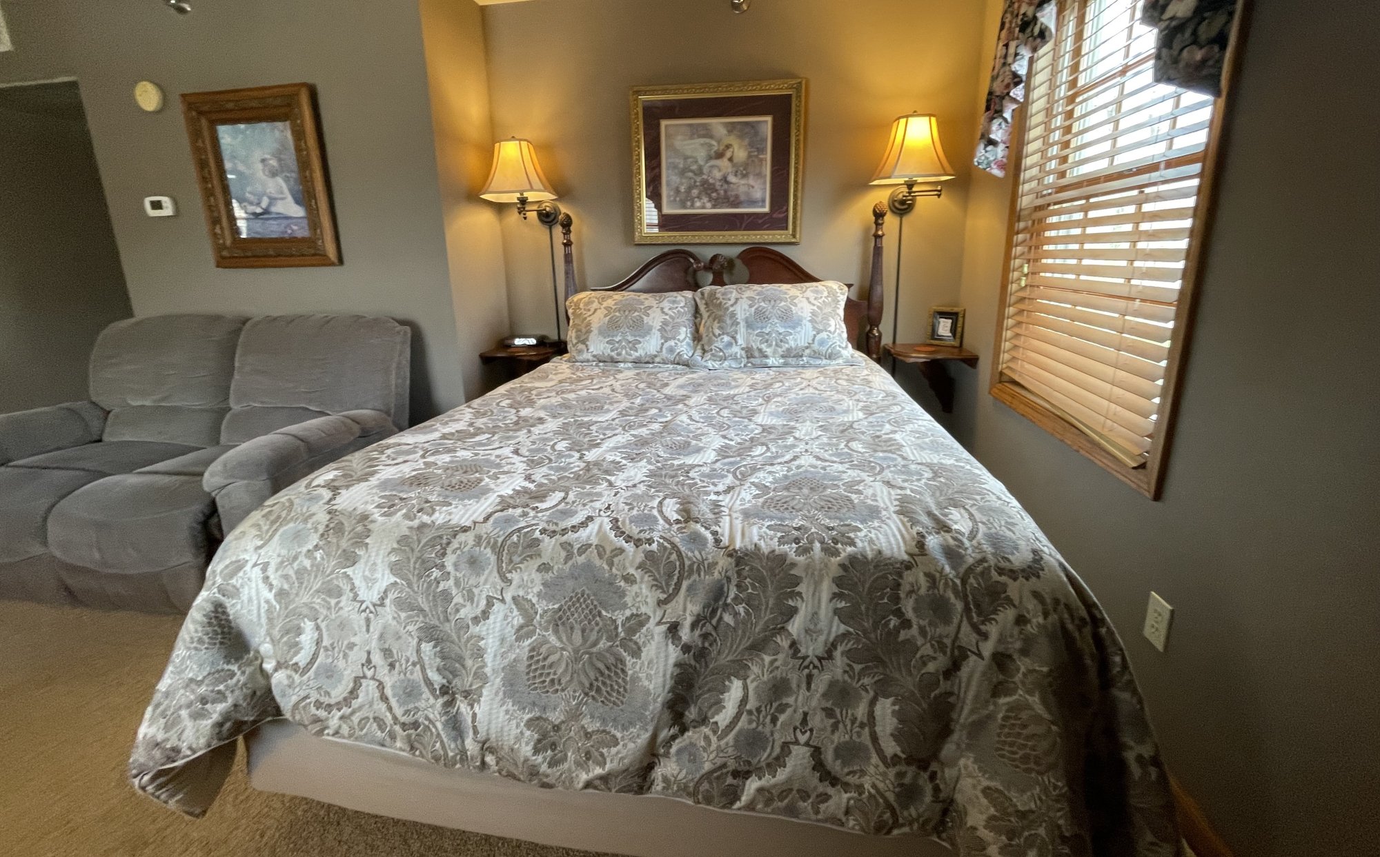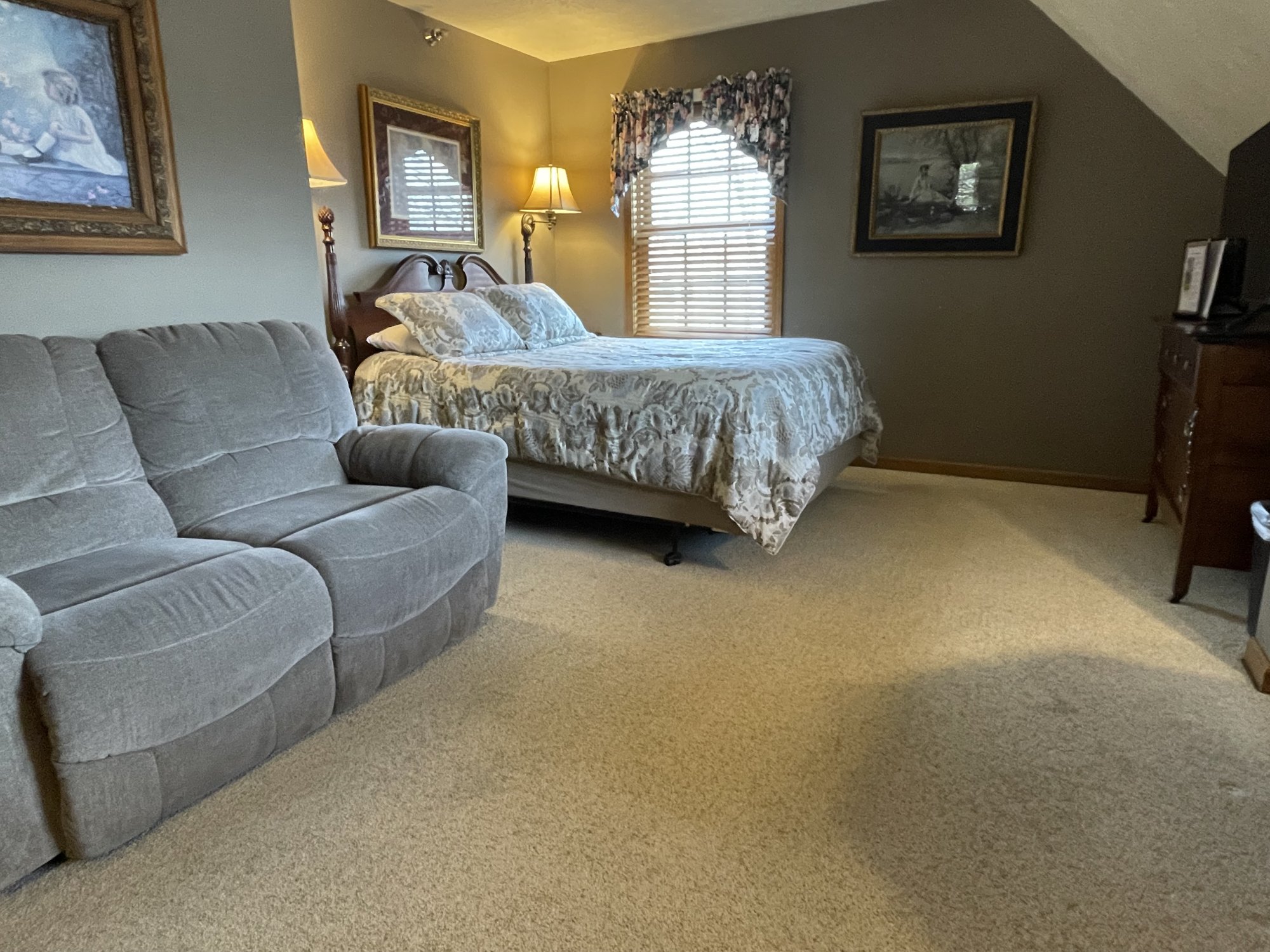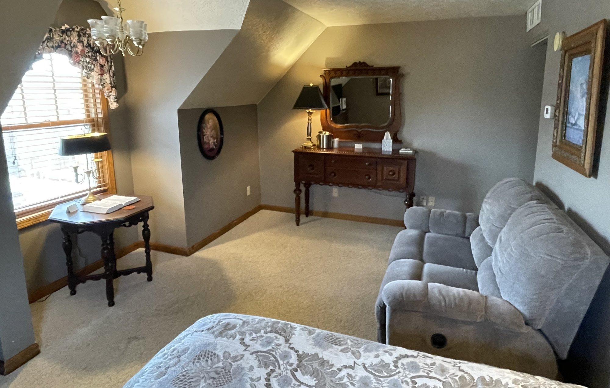 Room #9 has one queen bed and a double loveseat recliner. Corner room on the third floor of the main building with south and east-facing windows. An elevator is available.